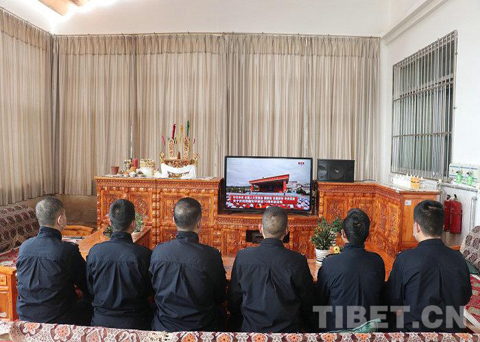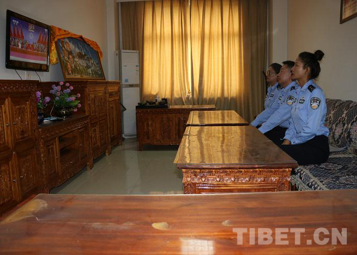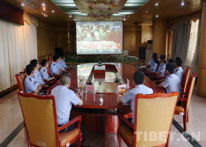 圖為西藏出入境邊防檢查總站執(zhí)法調(diào)查支隊(duì)廣大民警收聽(tīng)收看慶祝西藏和平解放70周年大慶直播盛況