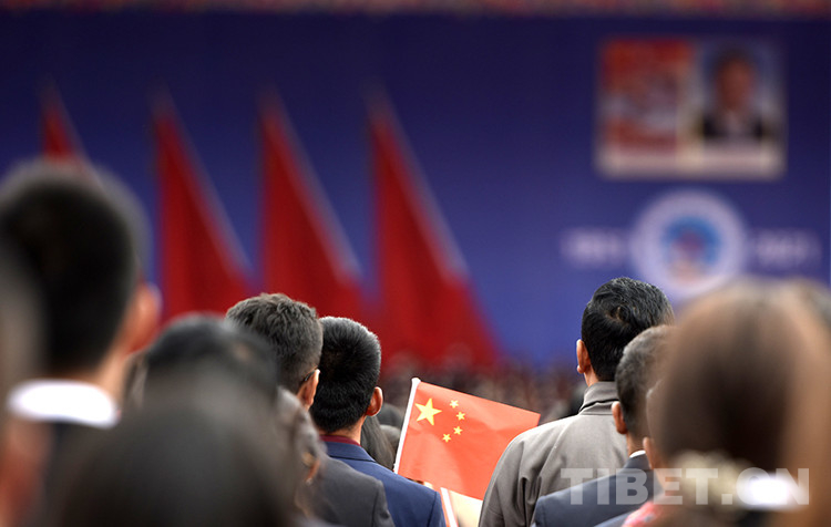 圖為8月19日上午,慶祝西藏和平解放70周年大會(huì)現(xiàn)場(chǎng),人們揮舞著國(guó)旗 攝影:王媛媛