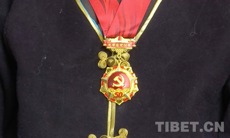 圖為洛桑曲珍老人胸前的光榮在黨50年紀(jì)念章 攝影:田江朋