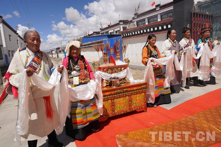 位于薩迦縣扯休鄉(xiāng)東北部的嘎吉林村,是庫區(qū)搬遷新村,2020年3月,全村139戶769人從海拔4000多米的土坯房搬遷到了這里海拔3800米的新房。得知班禪要來的喜訊,嘎吉林村村民及信教群眾身著節(jié)日盛裝、手捧潔白哈達(dá),一早就自發(fā)聚集在村廣場上迎候班禪。村民旦珍高興地對記者說道:“自從搬到這兒以后,政府給我們每人分了5.5畝田地,每戶人家都享受著國家搬遷優(yōu)惠政策,住上了福利幸福房。尤其是有了村里的集體合作社,再也不用像以前那樣單打獨斗各家做各自的事了。現(xiàn)如今,無論是生活還是經(jīng)濟收入都一年比一年好?!?/p>