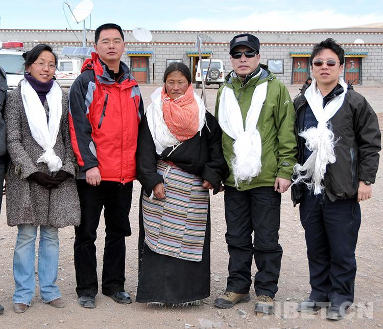 圖為中國石化第五批援藏干部、班戈縣副書記陳志清(左二)和常務(wù)副縣長潘峰(右一)專程到班戈縣新吉鄉(xiāng)接脖子下長著巨大腫瘤的牧女斯求卓瑪進京治病時,在鄉(xiāng)政府一同合影留念(王普2010年3月26日攝)
