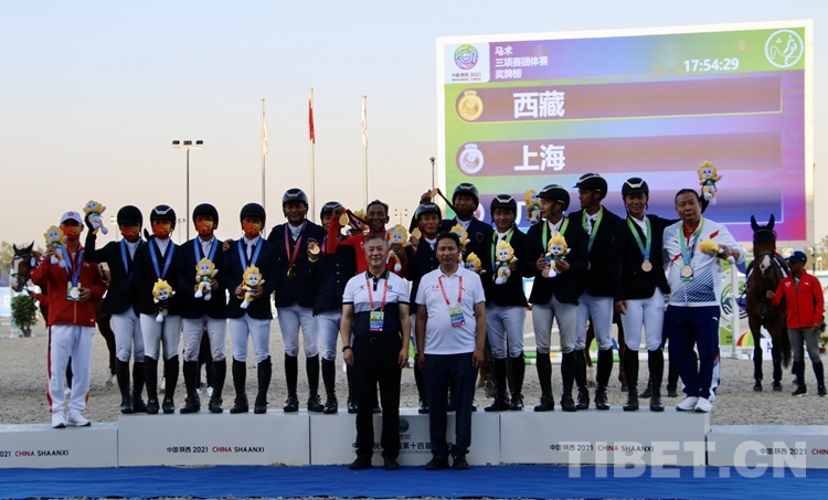 圖為西藏代表隊在馬術三項賽團體賽摘金后合影留念