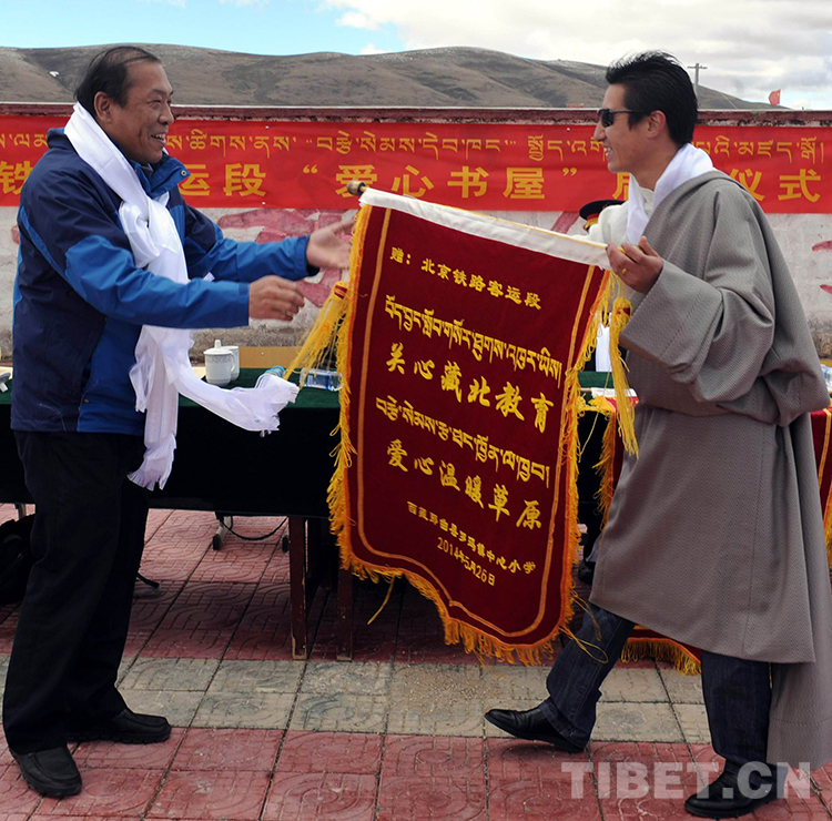 這是西藏那曲地區(qū)那曲縣(現(xiàn)那曲市色尼區(qū))羅瑪鎮(zhèn)中心小學校長拉巴格桑(右)代表學校向北京鐵路客運段代表王博軒(左)贈送錦旗(唐召明2014年5月29日攝)