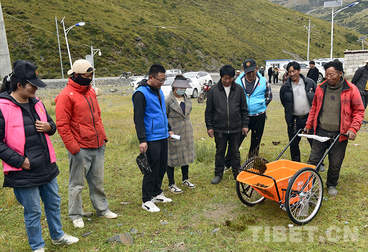 當(dāng)天的發(fā)放儀式上,共向索縣西昌鄉(xiāng)發(fā)放撿拾車200輛、鐵鍬200把、高原野炊灶鍋20個(gè)、牛糞商品編織袋2000個(gè)。我作為北京建藏援藏工作者協(xié)會(huì)新任秘書長(zhǎng)與志愿者們一起,向接受捐贈(zèng)的牧民群眾詳細(xì)介紹和演示撿拾車的組裝和使用技巧。