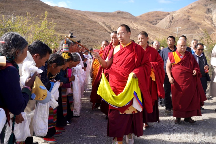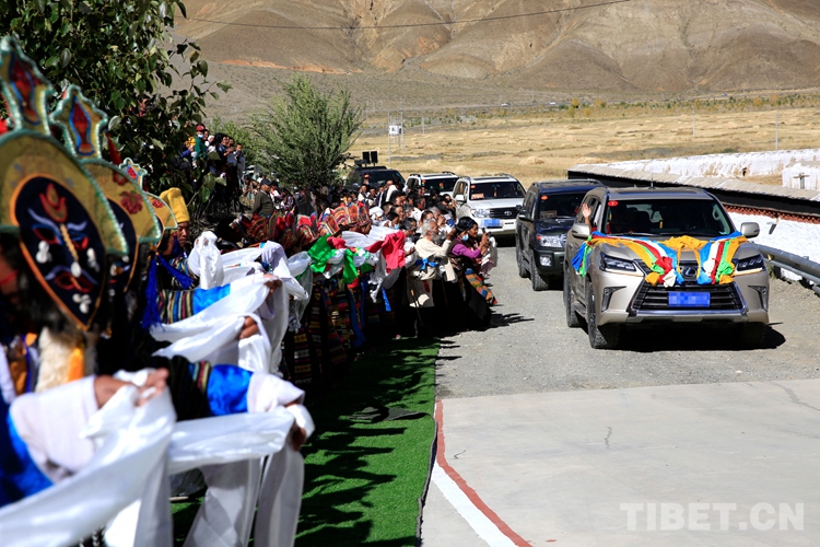 沿途農(nóng)牧區(qū)的信教群眾聞?dòng)嵡皝?lái),身著傳統(tǒng)節(jié)日盛裝、手捧潔白哈達(dá),隊(duì)伍綿延數(shù)里,虔誠(chéng)迎候班禪的到來(lái)。每當(dāng)遇到前來(lái)迎接的信教群眾,班禪便示意車(chē)輛緩行,開(kāi)窗向信眾揮手致意,氣度不凡又格外親切。