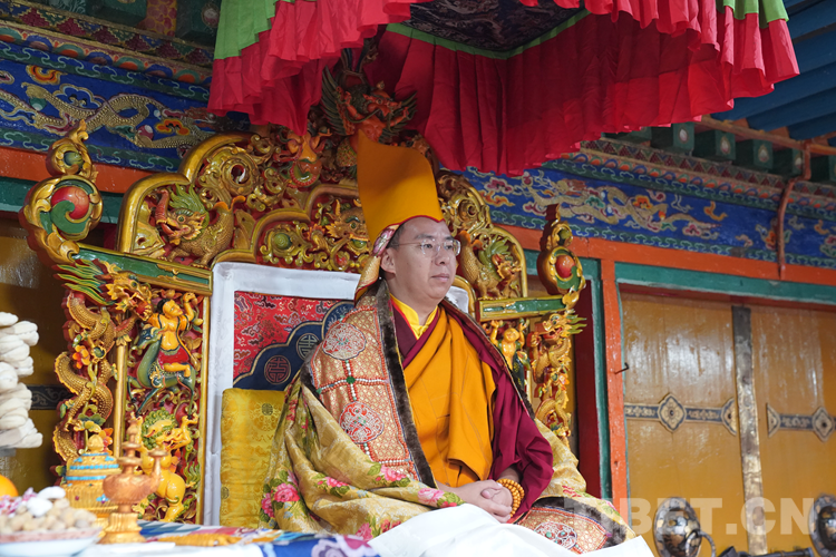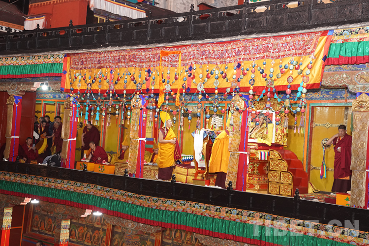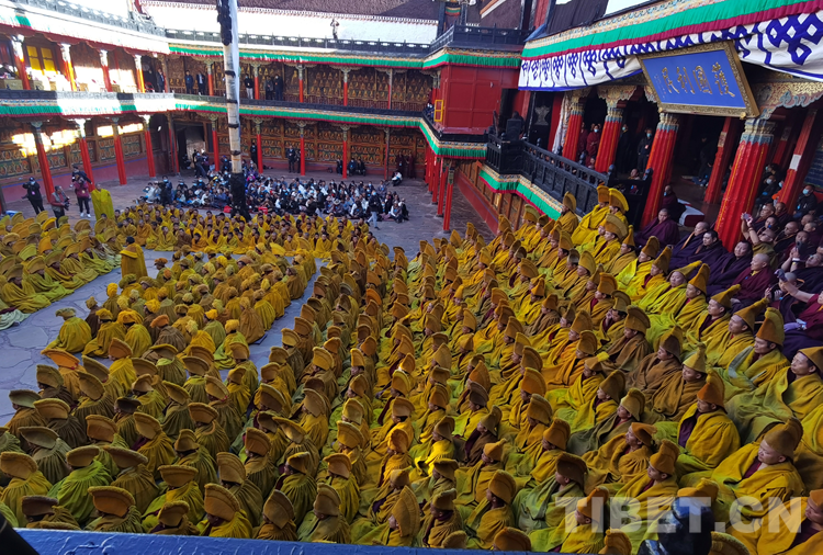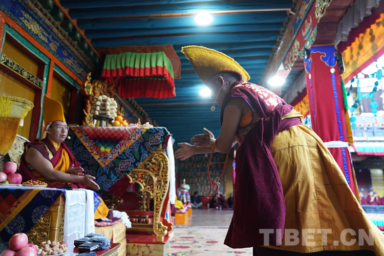 經(jīng)過數(shù)日準(zhǔn)備,26日下午,班禪于扎什倫布寺參加嘎欽學(xué)位立宗答辯。來自西藏自治區(qū)藏傳佛教各教派的堪布、經(jīng)師等高僧以及扎什倫布寺僧眾、信教群眾等800人共赴盛會、共享法喜。