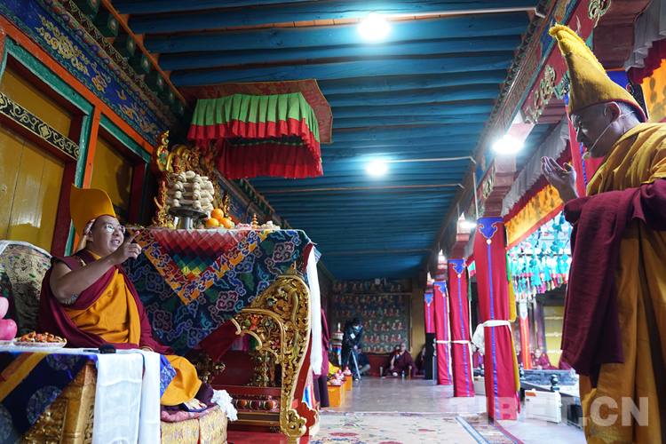 下午4點(diǎn),日喀則碧空如洗、風(fēng)和日暄,僧眾齊聚扎什倫布寺多加大院,開始共同誦念《度母經(jīng)》《皈依心經(jīng)》《頌度母經(jīng)》《大白傘蓋經(jīng)》《波羅蜜多心經(jīng)》,隨著法螺、法號響起,班禪由手持香爐和吹嗩吶僧人引路、手持黃傘的僧人護(hù)送,緩緩步入多加大院,登上寶座,同僧眾共同誦念經(jīng)典?,F(xiàn)場法號聲聲、梵音裊裊,場面莊嚴(yán)而隆重。