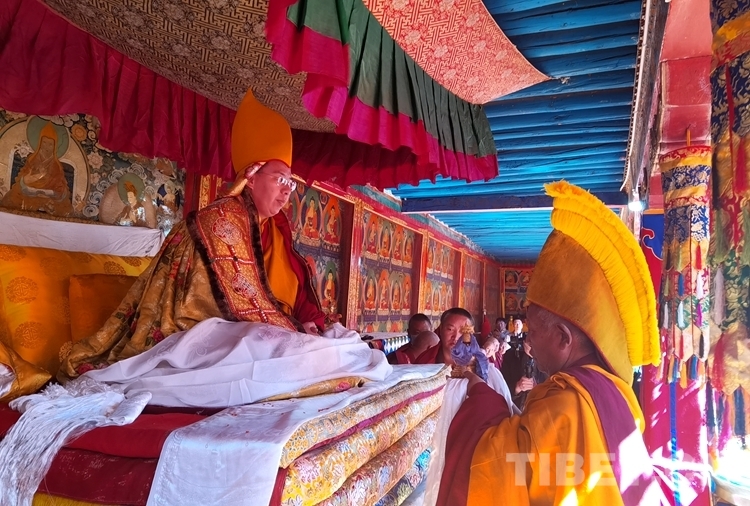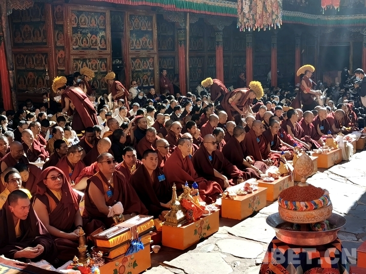 上午10時(shí),隨著法號(hào)響起,領(lǐng)經(jīng)師領(lǐng)經(jīng)下僧眾開始集體誦經(jīng),班禪由手持香爐和吹嗩吶僧人引路來到扎什倫布寺多加大院。慶祝儀式上,扎什倫布寺高僧活佛、各寺廟僧尼代表及班禪親屬依次敬獻(xiàn)曼扎、禮品。同時(shí),扎什倫布寺僧人在會(huì)場(chǎng)上以辯經(jīng)、跳“卡爾”舞等方式祝賀,并向現(xiàn)場(chǎng)信教群眾發(fā)放酥油茶、人參果、八寶飯等,共沾法喜。場(chǎng)面恢宏,恭敬威儀。