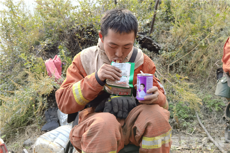 圖為指戰(zhàn)員就地食用自熱食品