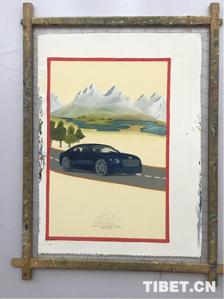 圖為新唐卡作品《賓利非凡之旅——飛馳在西藏的青山綠水之間》 作者:旦巴 翻拍:拉姆