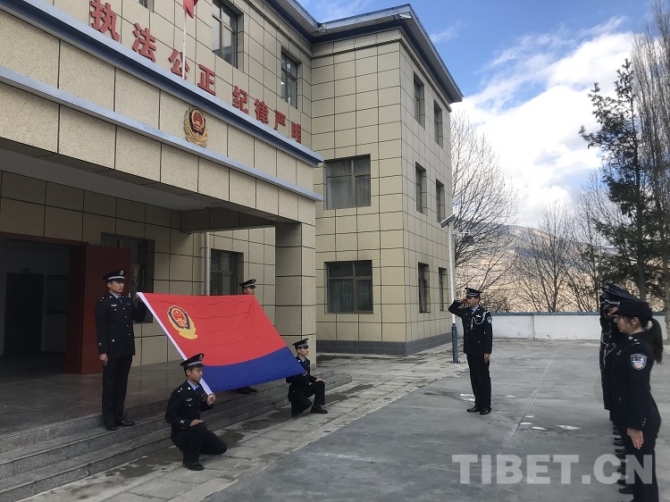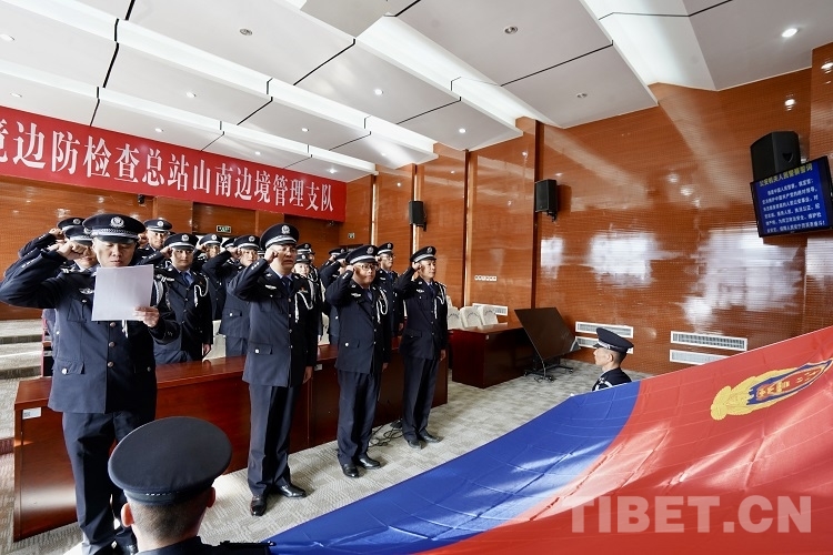 圖為山南邊境管理支隊機關(guān)移民管理警察重溫入警誓詞 攝影:索朗次旺