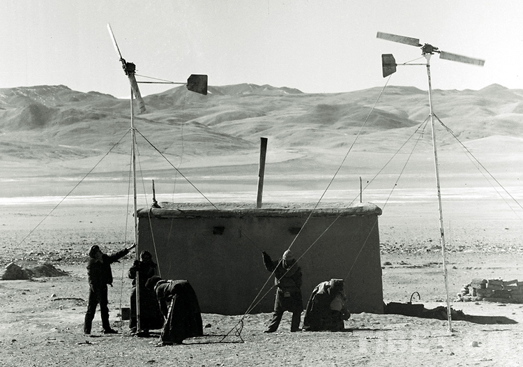 這是那曲地區(qū)風(fēng)能試驗(yàn)站技術(shù)人員在對那曲地區(qū)雙湖辦事處(現(xiàn)那曲市雙湖縣)嘎措鄉(xiāng)的風(fēng)力發(fā)電機(jī)進(jìn)行檢修保養(yǎng)(唐召明1988年攝)