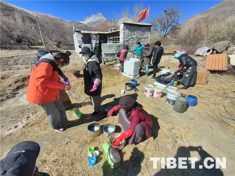 圖為黨員們幫助羅布次仁打掃家務(wù)