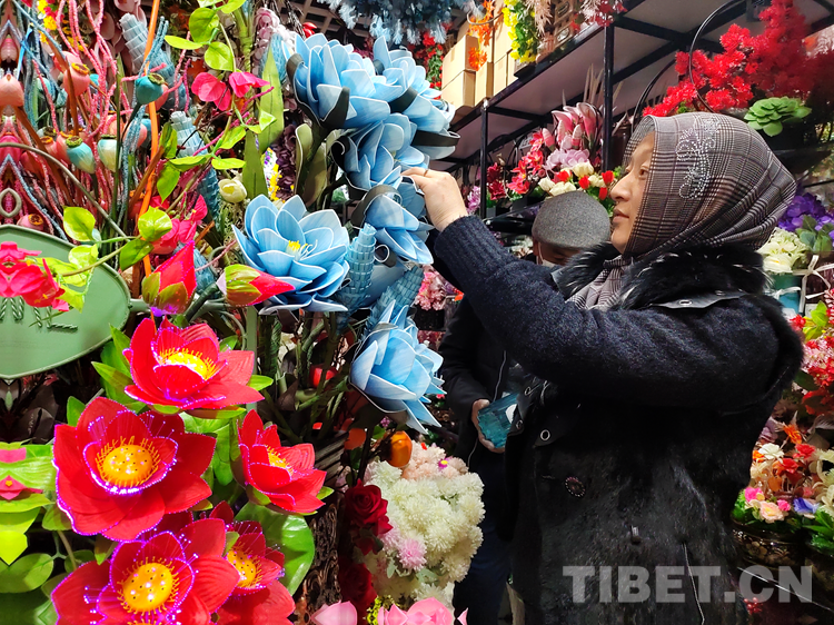 “我家店里客人挺多的,尤其這幾天,首先是因?yàn)槲覀兊幕ǚN齊全,應(yīng)有盡有,價(jià)格也實(shí)惠,其次我們之間能進(jìn)行簡單的溝通,我會(huì)一些日常簡單的藏語,他們也會(huì)說一些漢語。所以挺受大家歡迎?!蹦履不ǚ坷习迥擦岣吲d地說。
