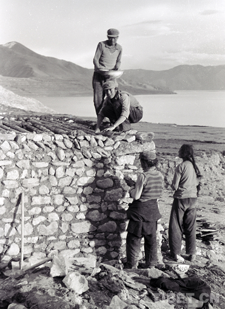 這是文部辦事處文部區(qū)文部鄉(xiāng)(現(xiàn)尼瑪縣文部鄉(xiāng)南村)的村民在當惹雍錯湖畔蓋石屋(唐召明1987年攝)