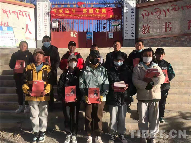 圖為拉孜縣熱薩鄉(xiāng)小學學生展示受捐圖書