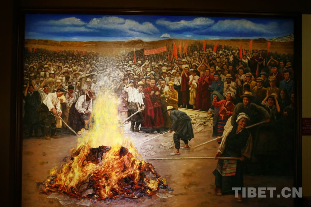 1959年3月,西藏開始實施民主改革,圖為達(dá)孜縣翻身農(nóng)奴正在焚燒契約和債券文書 翻拍:許娜