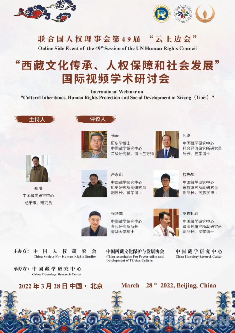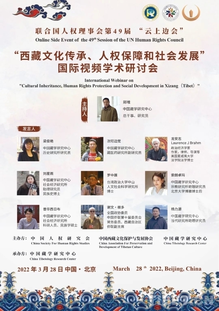 中國西藏網(wǎng)訊 3月28日,聯(lián)合國人權(quán)理事會第49屆“云上邊會”“西藏文化傳承、人權(quán)保障和社會發(fā)展”國際視頻學(xué)術(shù)研討會在北京舉行,國內(nèi)外有關(guān)專家學(xué)者40余人以線上線下相結(jié)合的方式參加了研討。