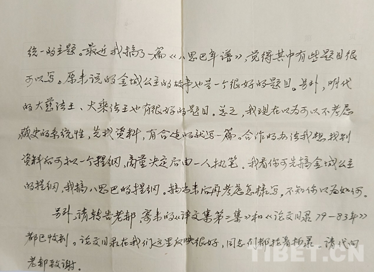 記得我大學畢業(yè)剛到新單位,人生地不熟,加之原來沉浸在“文學夢”中,現(xiàn)在陡然轉(zhuǎn)到藏族歷史研究,所謂基礎不牢地動山搖,困惑加不適,可想而知。陳老師在聊天中得知我的情況后,談到文史不分家,自己對文學也很有興趣,與青?!跺3薄肪庉嫼苁煜?。這樣,我遇到一個學識淵博的良師益友,聆聽指教,何其難得。在陳老師的鼓勵和幫助下,我在惶惑中嘗試把歷史與文學結(jié)合起來,與他合作發(fā)表了歷史故事新編《長安和親》《香波山奇遇—吐蕃聶墀贊普的故事》等,平穩(wěn)地完成了專業(yè)變動的過渡期。后來,他離開中央民族學院到青海社會科學院工作,我們之間仍堅持信件往來,得到他很多幫助。每一次通信,我們談得最多的都是學術(shù)。在某次回信中,他談及下一步合作的工作,特別提到“至于今后如何搞,我想原來定的歷史故事新編計劃似乎是太大了一點。主要從藏族史的系統(tǒng)性考慮,而沒有考慮到現(xiàn)實的需要。所以我想還是先寫主題符合現(xiàn)實需要的題目,寫歌頌民族團結(jié)、文化交流,國家統(tǒng)一的主題。最近,我搞了一篇《八思巴年譜》,覺得其中有些題目很可以寫。原來說的金城公主的故事也是一個很好的題目。另外,明代的大慈法王、大乘法王也有很好的題目??傊椰F(xiàn)在認為可以不考慮藏族史的系統(tǒng)性,先找資料,有合適的就寫一篇。合作的辦法我想找到資料后,可擬一個提綱,商量決定后,由一人執(zhí)筆。我看你可先搞金城公主的提綱,我搞八思巴的提綱,搞出來后再考慮怎樣寫,不知你以為如何?!?/p>