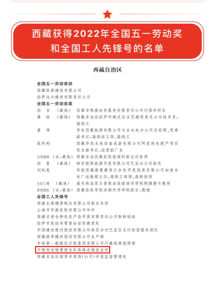 中國(guó)西藏網(wǎng)訊 2022年4月28日,中華全國(guó)總工會(huì)發(fā)布2022年全國(guó)五一勞動(dòng)獎(jiǎng)和全國(guó)工人先鋒號(hào)表彰人選(集體)名單,西藏出入境邊防檢查總站日喀則邊境管理支隊(duì)珠峰邊境派出所獲“全國(guó)工人先鋒號(hào)”稱號(hào)。