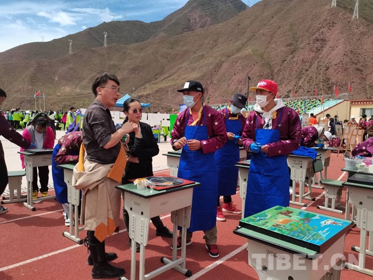圖為扎西格勒老師教授唐卡漆畫(huà)專業(yè)同學(xué)作畫(huà)