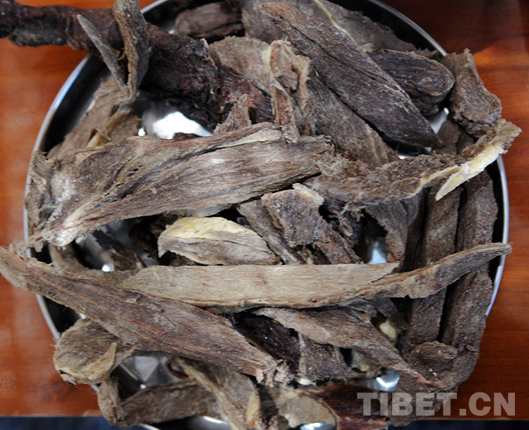 藏北草原的冬天地凍天寒,冬宰后的牛羊肉在房子和帳篷外自然冰凍,這個(gè)季節(jié)人們則多吃凍肉。凍肉一般是用溫水泡軟后煮“土巴”吃,個(gè)別的時(shí)候也有生吃的。風(fēng)干肉是藏北很特殊的食物。每年冬宰后,各家各戶都要做風(fēng)干肉,以備來年之需。