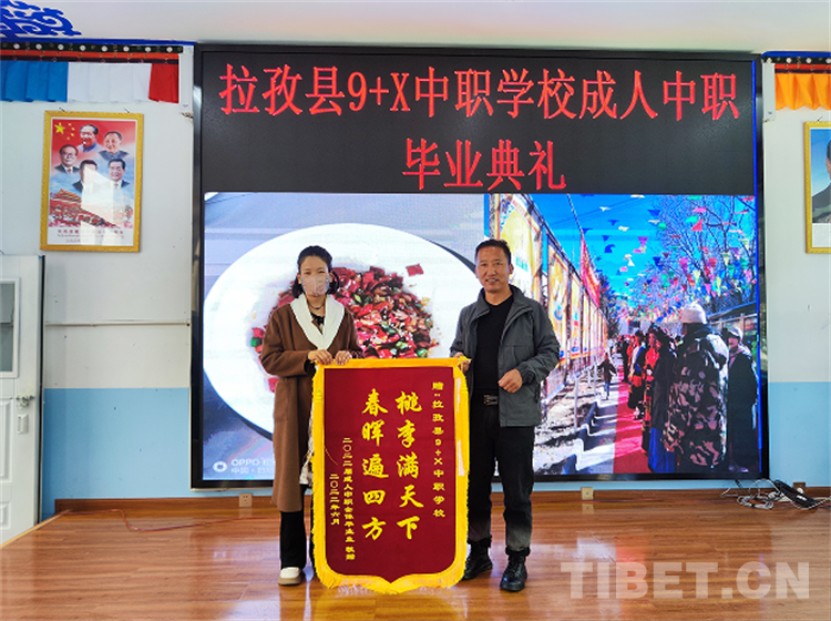典禮上,拉孜縣9+X中職學(xué)校校長(zhǎng)旦珍旺加對(duì)廣大畢業(yè)生殷殷囑托,希望他們?cè)诮窈蟮墓ぷ鲘徫簧鲜聵I(yè)有成、蒸蒸日上。隨后由成人中職學(xué)校代表、學(xué)生家長(zhǎng)向?qū)W校贈(zèng)送錦旗,以感謝學(xué)校一直以來(lái)為學(xué)生們提供學(xué)習(xí)與實(shí)踐平臺(tái),為孩子們培養(yǎng)技能。