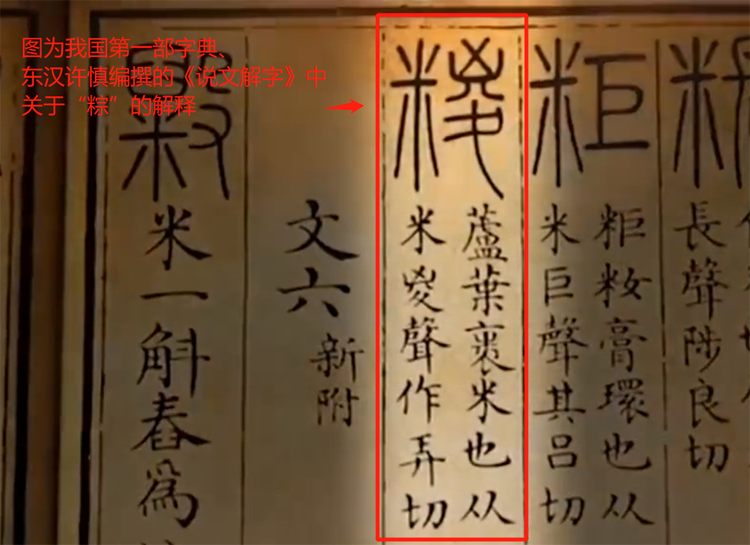 關(guān)于粽子,比較早的文字記載,在距今近2000年前,由東漢學者許慎編纂的我國第一部真正意義上的字典《說文解字》中可以找到——“糉,蘆葉裹米也”。這個記載言簡意賅地說明了制作粽子的原料和方法。“糉”字就是我們現(xiàn)在使用的“粽”字。