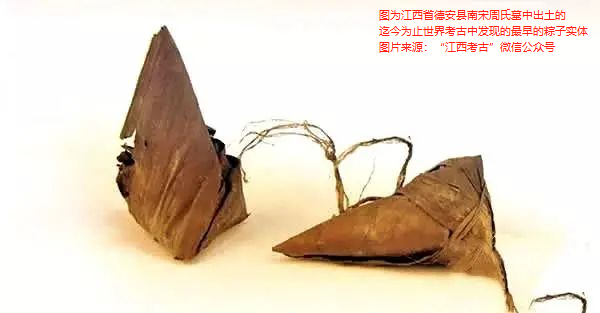 1988年,在江西省德安縣的南宋周氏墓中出土了迄今為止世界考古中發(fā)現(xiàn)的最早的粽子實體。有趣的是,開棺時,工作人員發(fā)現(xiàn),墓主的手上拿著一根桃木枝,而桃木枝上掛著的,赫然是兩個實體粽子。用粽子作陪葬品很少見,據(jù)考古專家分析,墓主逝去于四月初十,大殮正值端午節(jié)前,可能生前愛吃粽子,所以就作為了陪葬品。據(jù)碑文記載,墓主周氏葬于公元1274年,所以,這是一對穿越了近750年時光來到我們面前的粽子。這對粽子呈菱角形,長6厘米、寬3厘米,外皮為粽葉,用天然蘆葦葉麻線捆扎,制作手法和材料與我們現(xiàn)在的粽子非常相近。這對珍貴的南宋粽子目前保存在江西省德安縣博物館。