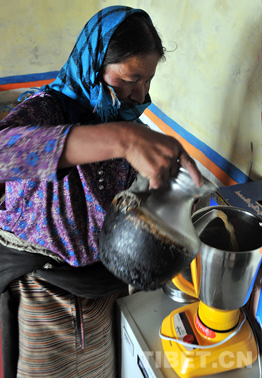 這是班戈縣新吉鄉(xiāng)術(shù)后的斯求卓瑪向放入酥油的電動攪拌壺里倒茶水,準備用電來打制酥油茶(唐召明2015年7月14日攝)