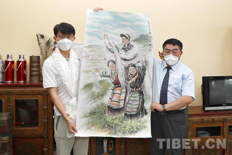 “我愛人看到了咱們館(西藏文化博物館)發(fā)的征稿啟事,然后就把這條信息發(fā)到家庭群里邊。過了不久,我父親說他畫了一張畫,讓我看看畫得怎么樣。我當(dāng)時(shí)還很意外,本來想鼓勵(lì)我兒子畫一張,結(jié)果我兒子沒畫,老爺子畫得還很好?!?月21日,張兆林先生將自己的作品《哈達(dá)寄深情》捐贈(zèng)給西藏文化博物館,張兆林之子張安誠將作品送至博物館并收到了捐贈(zèng)證書。