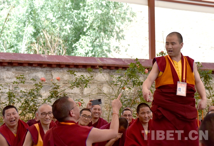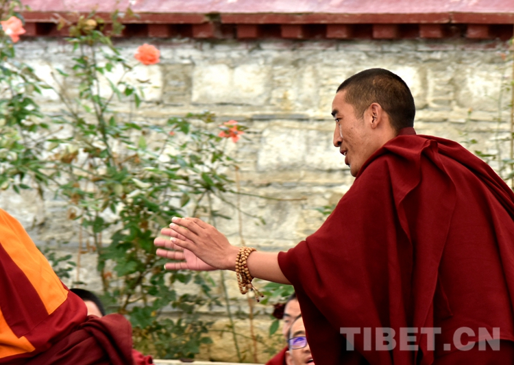 中國西藏網(wǎng)訊 身穿絳紅色袈裟,坐者仔細聆聽、站立者臂套念珠、迸出佛學妙語;圍觀者不時大笑……這是6月21日下午記者在西藏佛學院辯經(jīng)場看到的“唇槍舌戰(zhàn)”。
