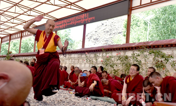 圖為6月21日下午,中國藏語系高級佛學(xué)院2022級“拓然巴”高級學(xué)銜班招生考試西藏考點現(xiàn)場,考僧正在互辯。攝影:王媛媛