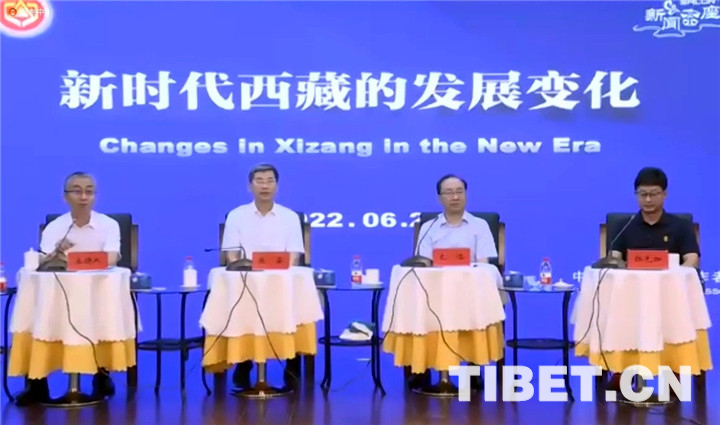 圖為6月22日,中國藏學(xué)研究中心二級研究員、學(xué)術(shù)委員會委員張?jiān)疲ㄗ蠖鐣?jīng)濟(jì)研究所所長、研究員扎洛(左三),宗教研究所副所長、副研究員拉先加(右一)參加中國記協(xié)舉辦的“新時代西藏的發(fā)展變化”新聞茶座 截圖:劉莉