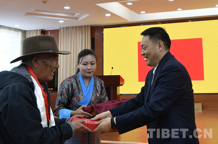 圖為西藏自治區(qū)黨委常委、統(tǒng)戰(zhàn)部部長(zhǎng),自治區(qū)政協(xié)黨組副書記、副主席嘎瑪澤登向“光榮在黨50年”的老黨員頓珠多吉頒發(fā)紀(jì)念章 攝影:王媛媛
