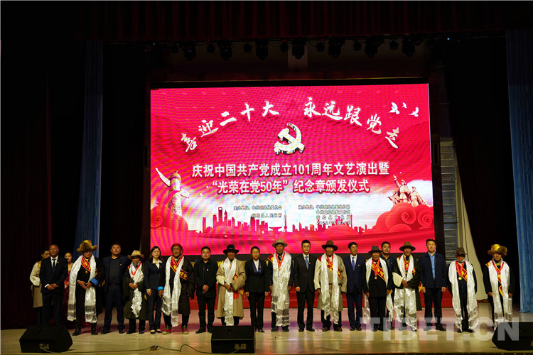 活動(dòng)現(xiàn)場(chǎng),為10名老黨員代表頒發(fā)了“光榮在黨50年”紀(jì)念章,敬獻(xiàn)了潔白的哈達(dá)。