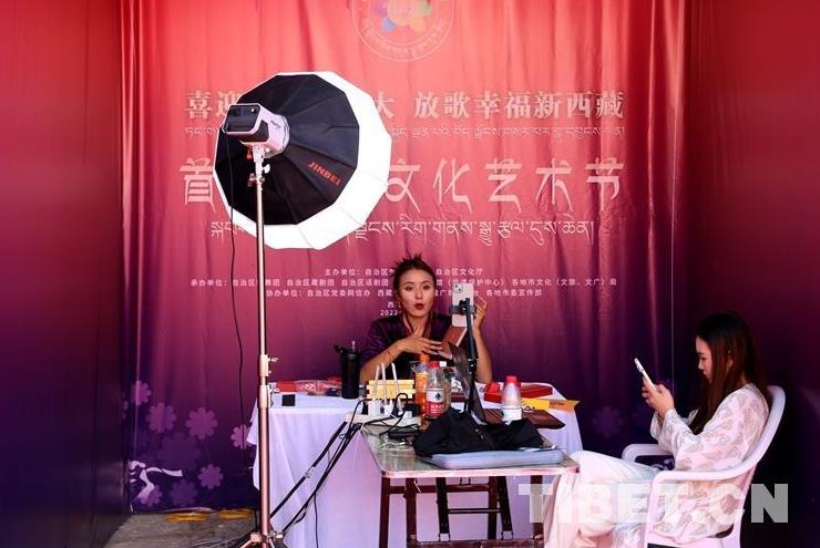 圖為在首屆西藏文化藝術(shù)節(jié)主場(chǎng)地——拉薩市金城公主劇場(chǎng)附近工作人員正在進(jìn)行直播帶貨 攝影:王佳豪