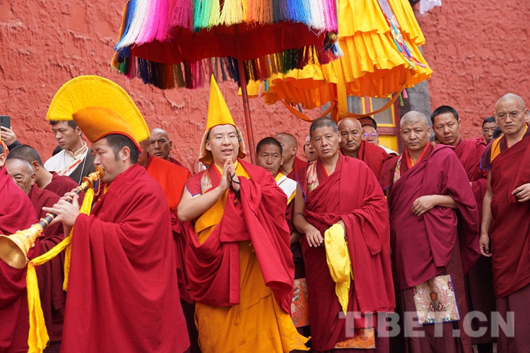 圖為班禪在手持黃傘、香爐的高僧引領(lǐng)下緩緩步行入寺 攝影:王淑