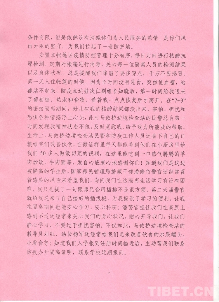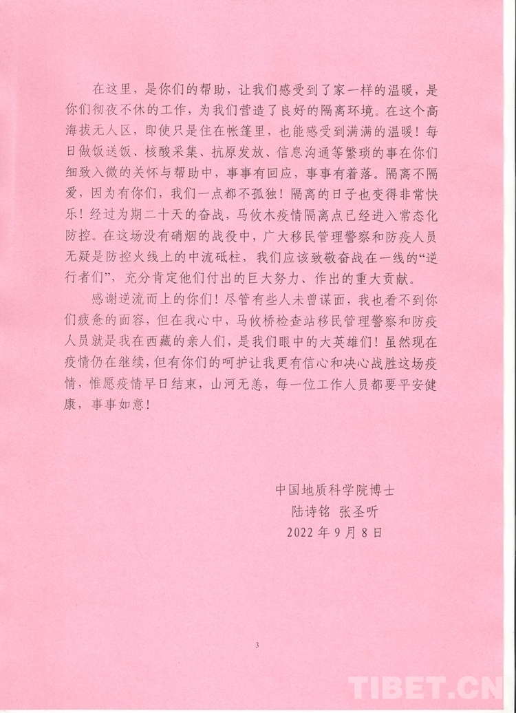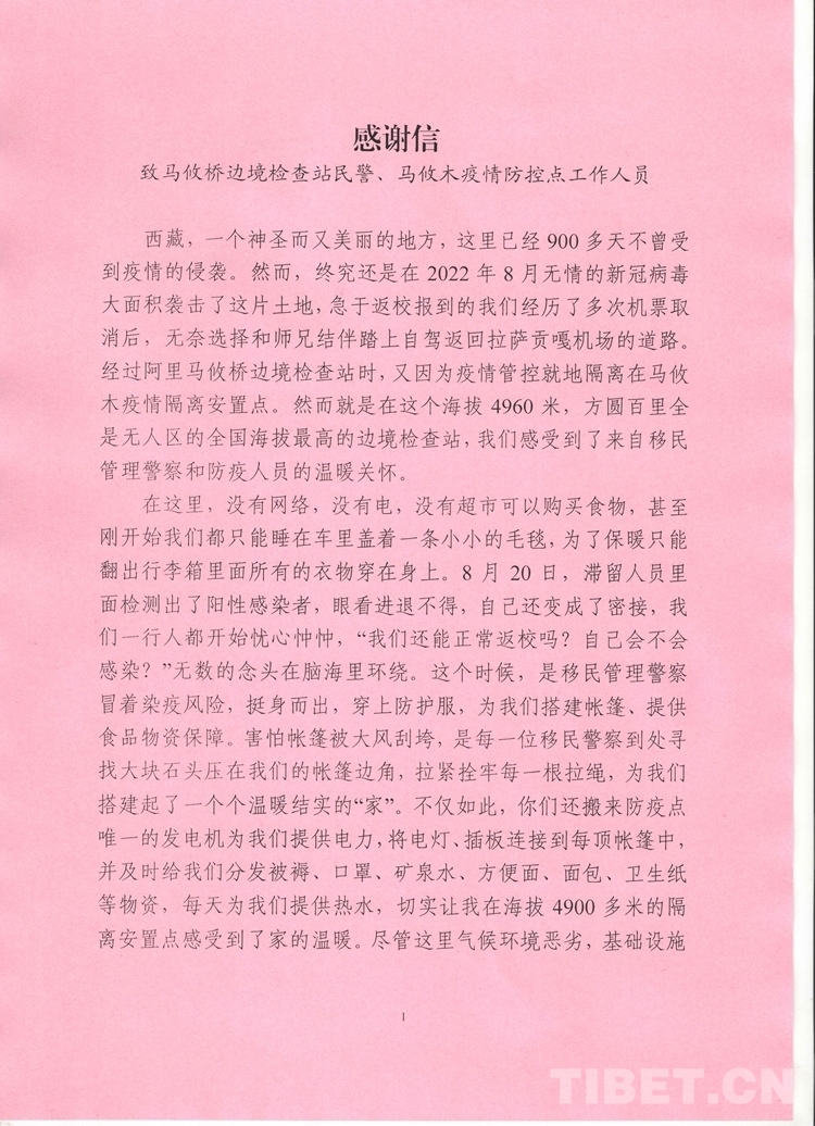 中國(guó)西藏網(wǎng)訊 “感謝逆流而上的你們!盡管有些人未曾謀面,我也看不到你們疲憊的面容,但在我心中,馬攸橋邊境檢查站移民管理警察,就是我在西藏的親人們,是我們眼中的大英雄們!”這段感人肺腑的言語(yǔ)來(lái)自西藏出入境邊防檢查總站阿里邊境管理支隊(duì)馬攸橋邊境檢查站臨時(shí)安置點(diǎn)馬攸木2名博士的一封感謝信。