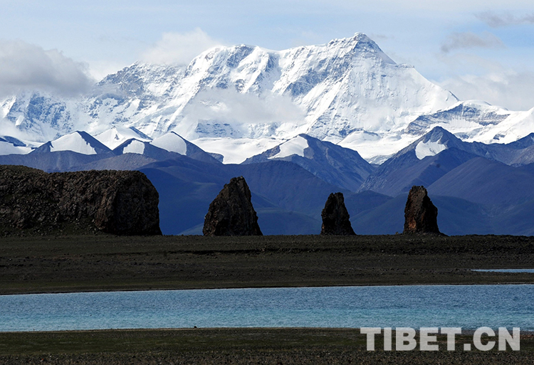 這是納木錯北岸的小島石柱和念青唐古拉山主峰及湖水構(gòu)成了一道美麗的風(fēng)景線(唐召明2012年8月4日攝)