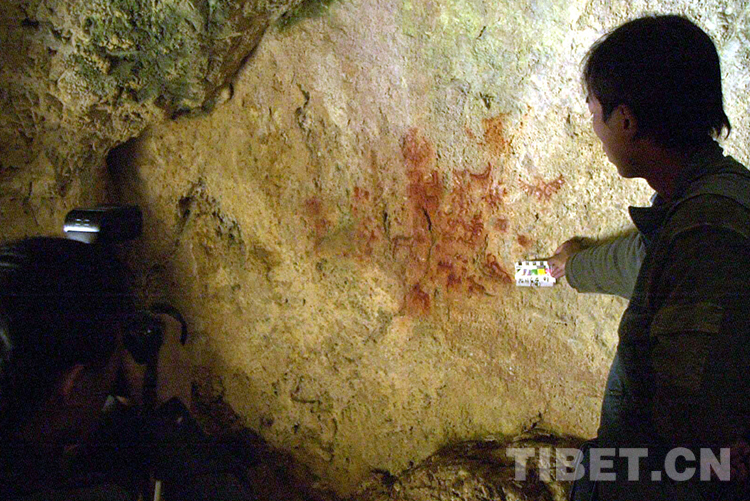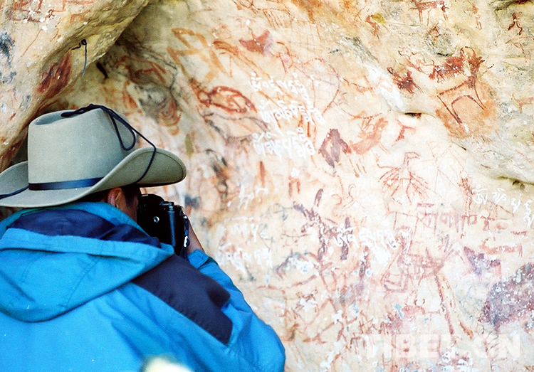 這是科考人員在對一處洞穴巖畫進(jìn)行考察拍照(唐召明2001年攝)