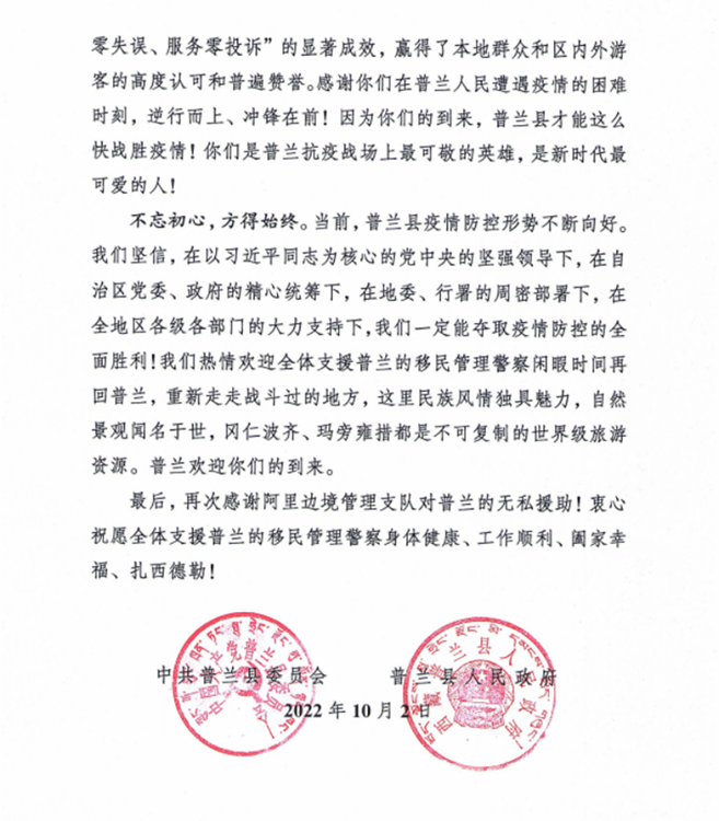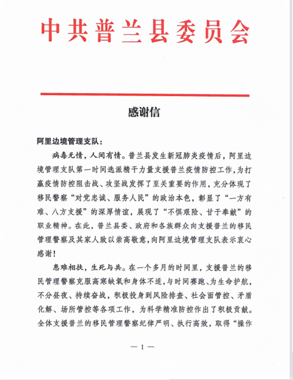中國西藏網(wǎng)訊 “普蘭縣發(fā)生新冠肺炎疫情后,阿里邊境管理支隊(duì)第一時間選派精干力量支援普蘭疫情防控工作,為打贏疫情防控阻擊戰(zhàn)、攻堅戰(zhàn)發(fā)揮了至關(guān)重要的作用?!?0月2日,西藏自治區(qū)阿里邊境管理支隊(duì)收到一封來自阿里地區(qū)普蘭縣委的感謝信。信中對阿里邊境管理支隊(duì)?wèi)?zhàn)“疫”一線民警在一個多月的疫情防控工作中,克服困難、勇于擔(dān)當(dāng)、不分晝夜、持續(xù)奮戰(zhàn)的抗疫工作表達(dá)了感謝,給予了肯定。
