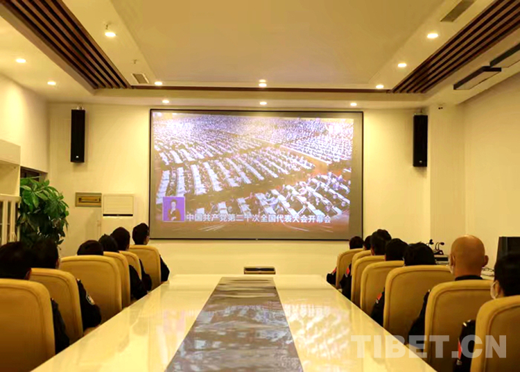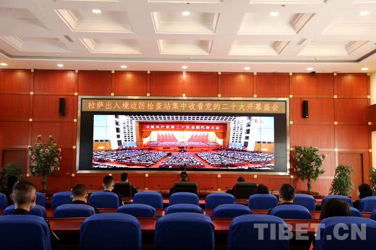 圖為拉薩出入境邊防檢查站機(jī)關(guān)民警在指揮中心會(huì)議室組織觀看黨的二十大開幕會(huì)盛況直播