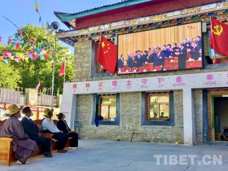 圖為西藏自治區(qū)林芝市朗縣朗鎮(zhèn)托麥村村干部通過電視大屏收聽收看黨的二十大開幕會 圖片由林芝市委宣傳部提供