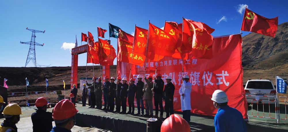 圖為在國網(wǎng)西藏電力阿里聯(lián)網(wǎng)工程黨、團(tuán)員突擊隊(duì)授旗儀式上,工程建設(shè)者們在世界屋脊高擎旗幟
