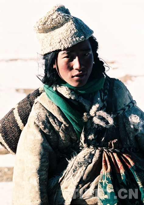這是過去一位身著光板老羊皮袍外出旅行的青年牧民(唐召明1991年初攝)