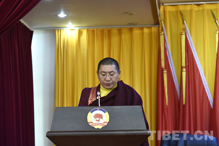 圖為12月12日,拉薩市政協(xié)十二屆三次會(huì)議第二次全體會(huì)議現(xiàn)場,宗教界委員曲仲·阿旺強(qiáng)久旦增加措發(fā)言 攝影:王媛媛