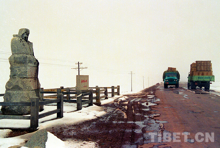 這是汽車正在通過青藏公路海拔5231米的唐古拉山口(唐召明1996攝)