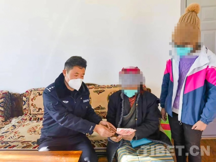 圖為江孜縣公安局重孜鄉(xiāng)派出所民警將追回的錢款送到老奶奶手中