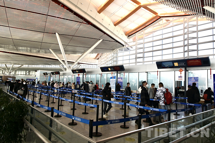 圖為拉薩貢嘎機(jī)場(chǎng)內(nèi)旅客正在排隊(duì)辦理托運(yùn)